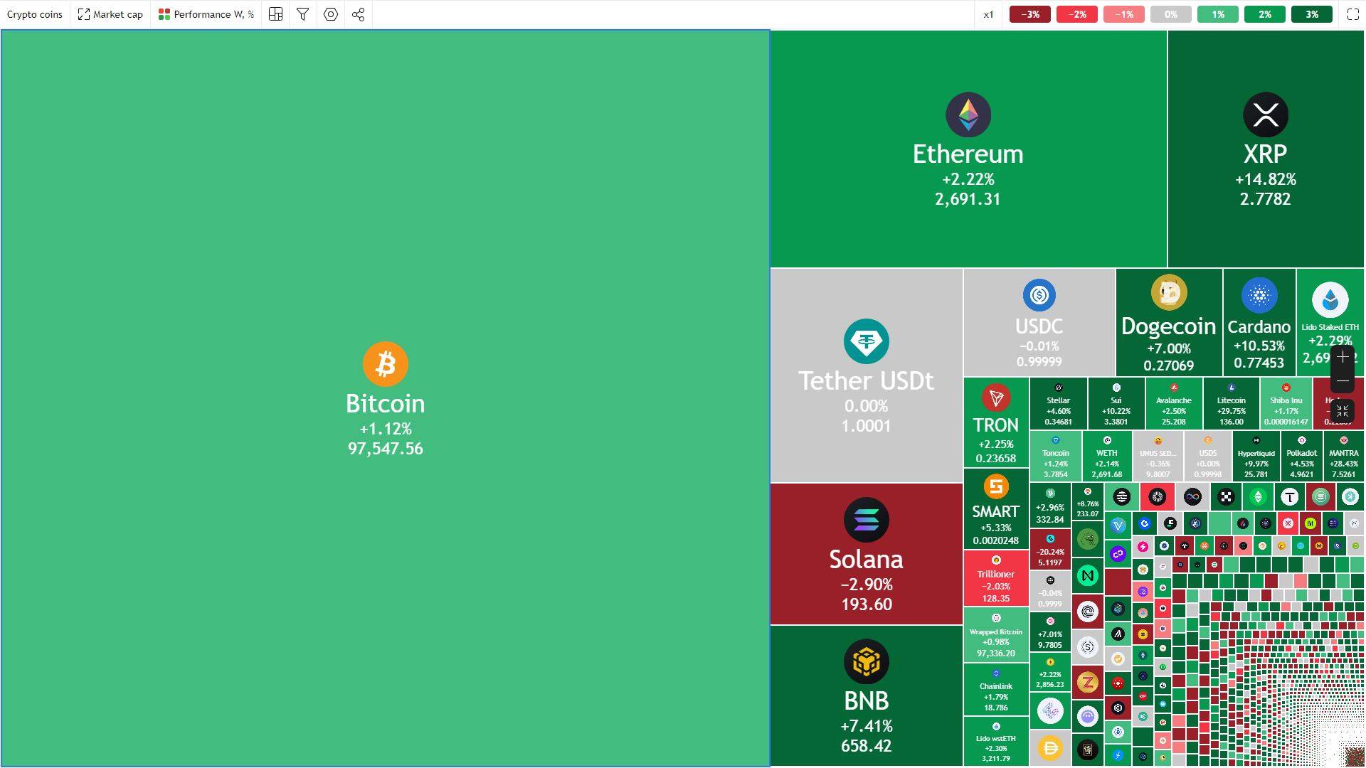 Biến động các đồng tiền mã hóa hàng đầu so với cách đây 7 ngày. Ảnh chụp màn hình TradingView vào lúc 10:00 AM ngày 16/02/2025