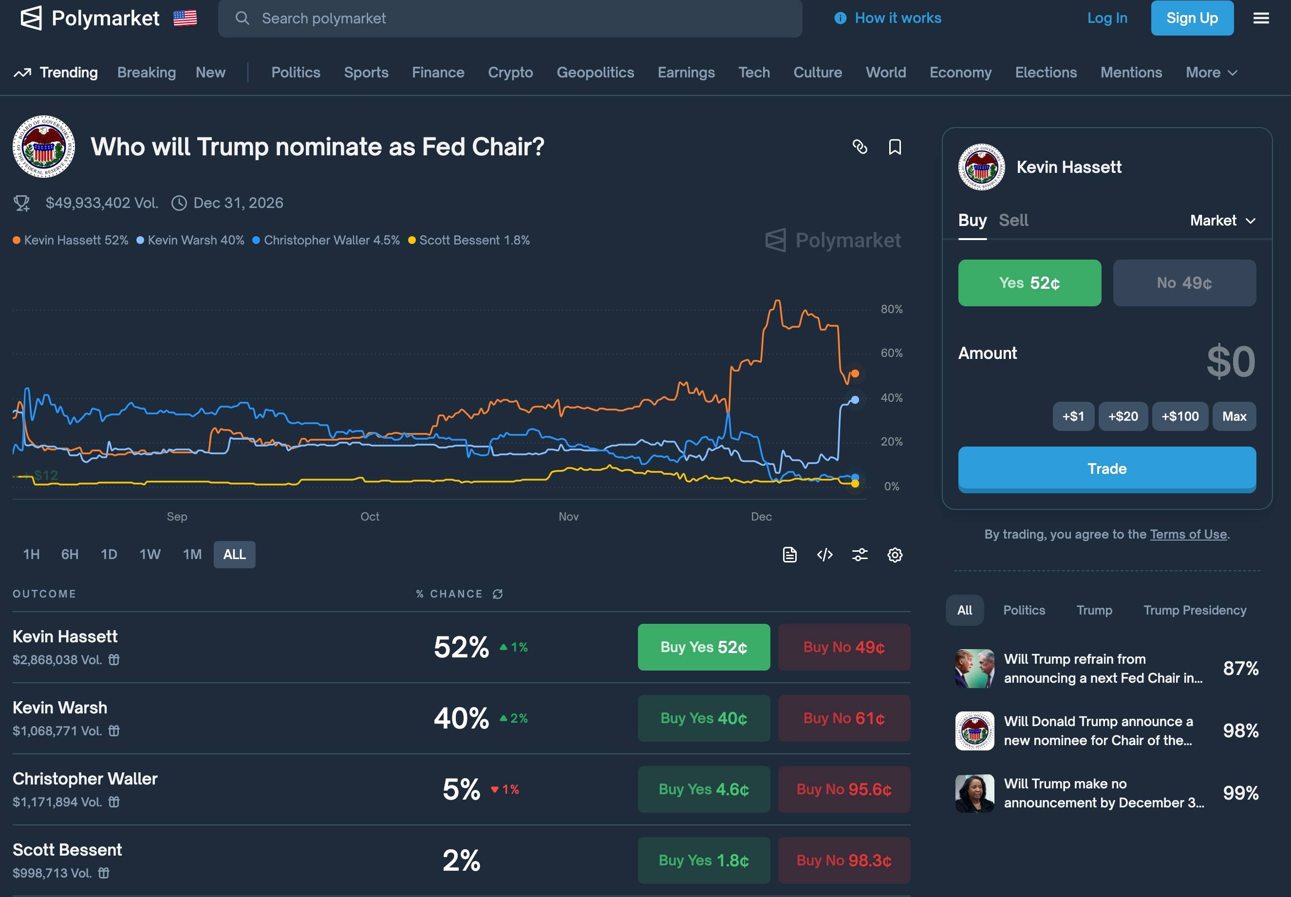 Trên các thị trường dự đoán, Hassett hiện dẫn đầu với xác suất khoảng 52% trở thành Chủ tịch Fed tiếp theo, theo dữ liệu từ Polymarket. Xếp sau là cựu Thống đốc Fed Kevin Warsh với 40%, dù xác suất của Warsh đã tăng vọt từ mức chỉ 13% sau khi ông có cuộc gặp trực tiếp với ông Trump vào tuần trước.