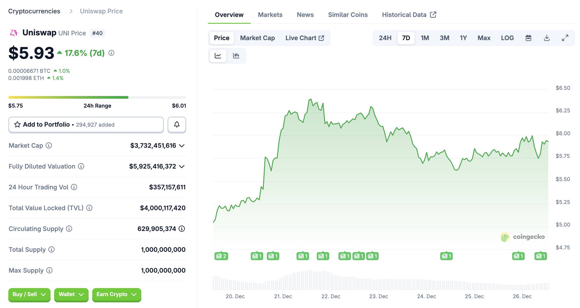 Biến động giá UNI trong 7 ngày qua, ảnh chụp màn hình trên CoinGecko lúc 12:38 AM ngày 26/12/2025