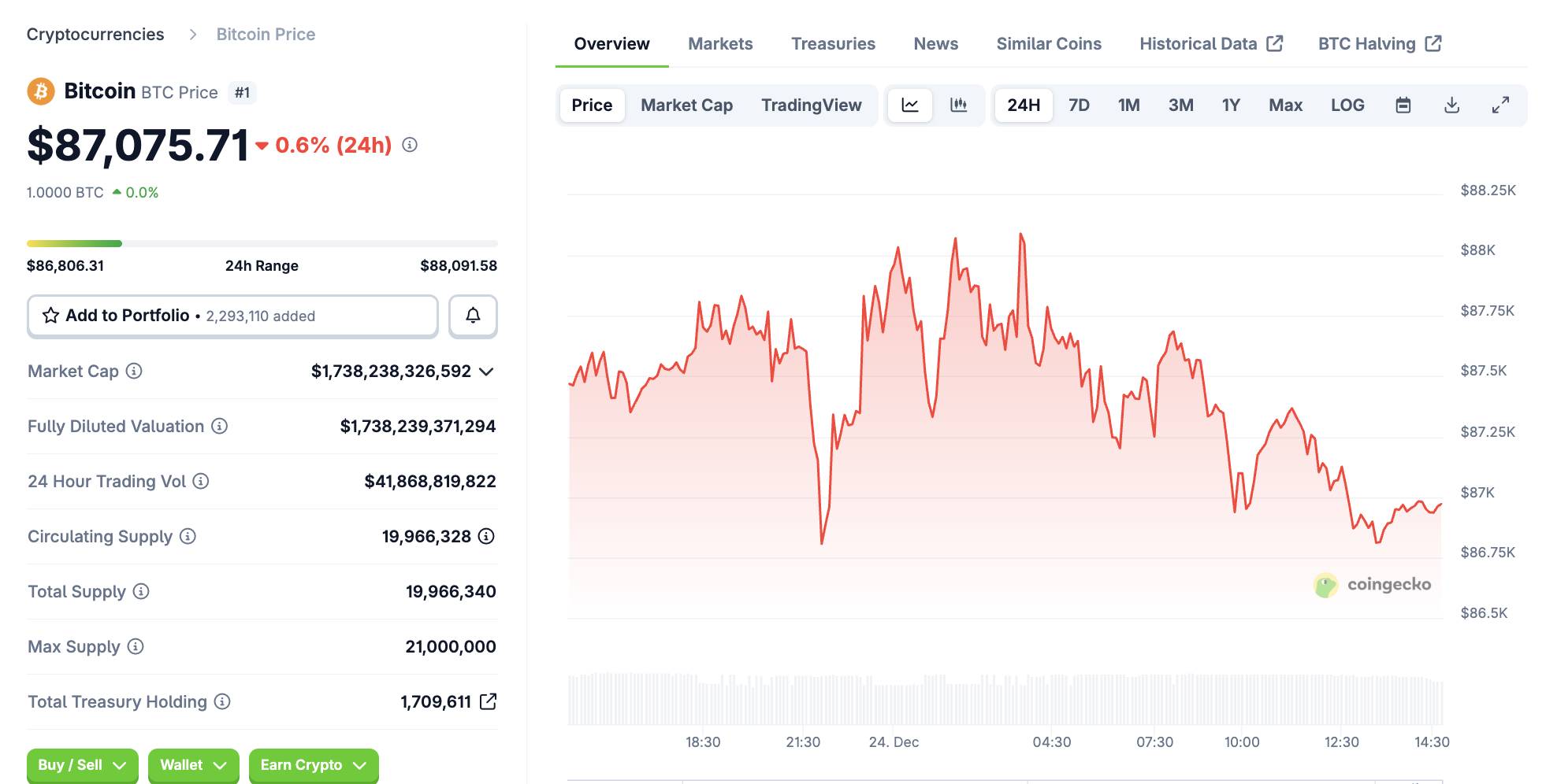 - Tại thời điểm viết bài, giá BTC hiện đang dao động quanh mức 87.075 USD, giảm nhẹ 0,6% trong 24 giờ qua.