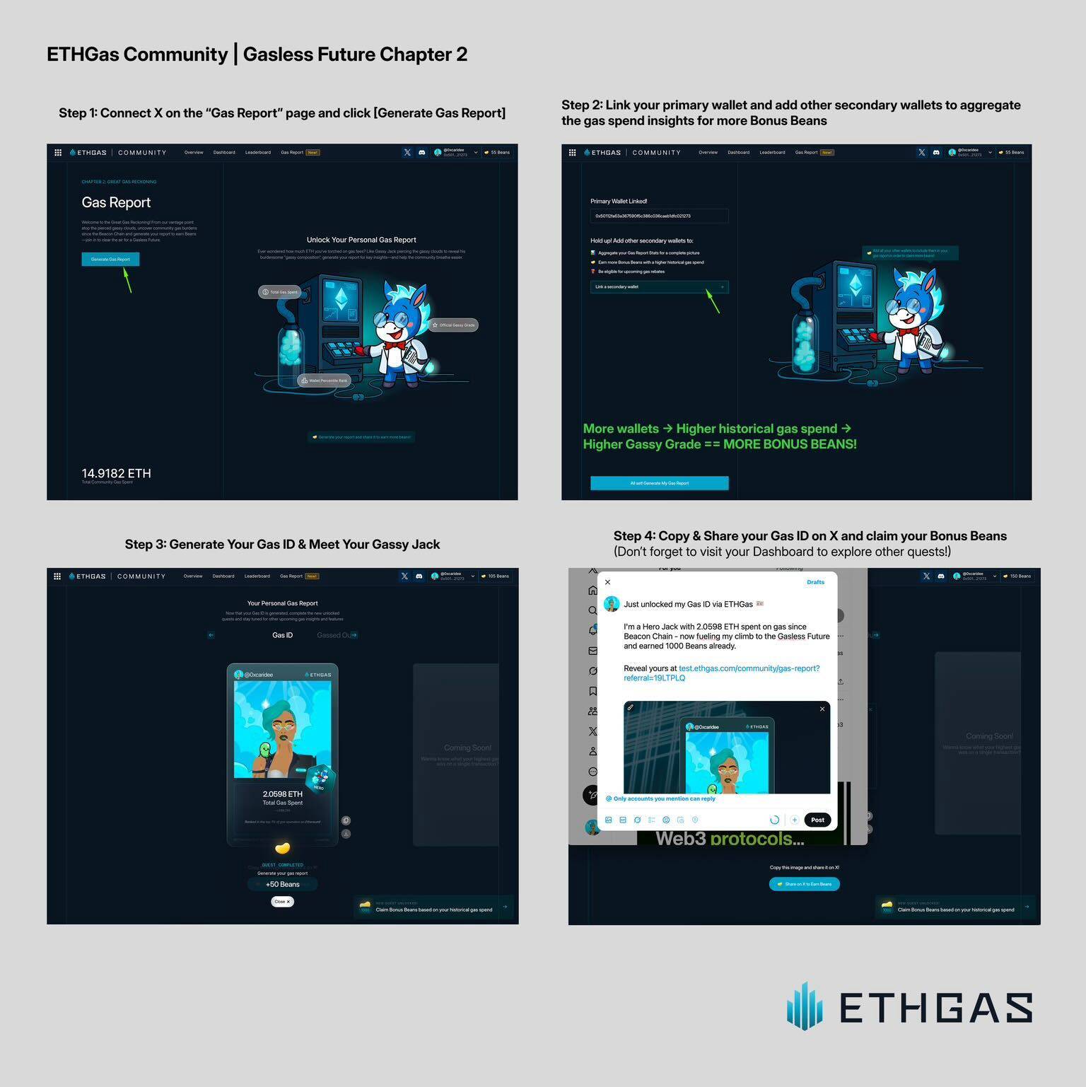 Điểm thưởng Beans là công cụ mở khóa những đặc quyền trong tương lai của ETHGas như các công cụ đặc biệt, phần thưởng giới hạn và tiếp cận sớm đến các tính năng mới trong hệ sinh thái.