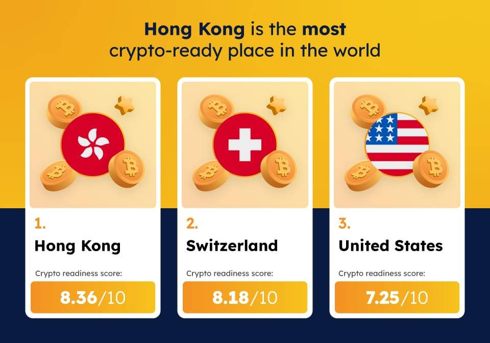 Hong Kong là quốc gia đạt được số điểm tốt nhất trong việc sẵn sàng áp dụng tiền mã hóa rộng rãi, với số điểm lên đến 8,36 trên thang điểm 10, vượt qua các quốc gia "thân thiện" crypto khác như Thụy Sĩ, Hoa Kỳ, Canada, Đức, và Panama.