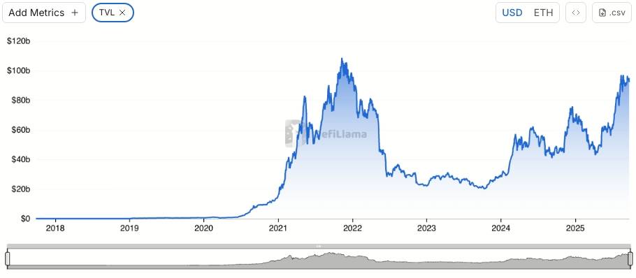 - Sự trở lại mạnh mẽ của dòng tiền đang củng cố lập luận này. TVL DeFi trên Ethereum vừa vượt ngưỡng 100 tỷ USD, một cột mốc cho thấy thị trường đang ưu ái trở lại với các sản phẩm ít rủi ro và hữu dụng.