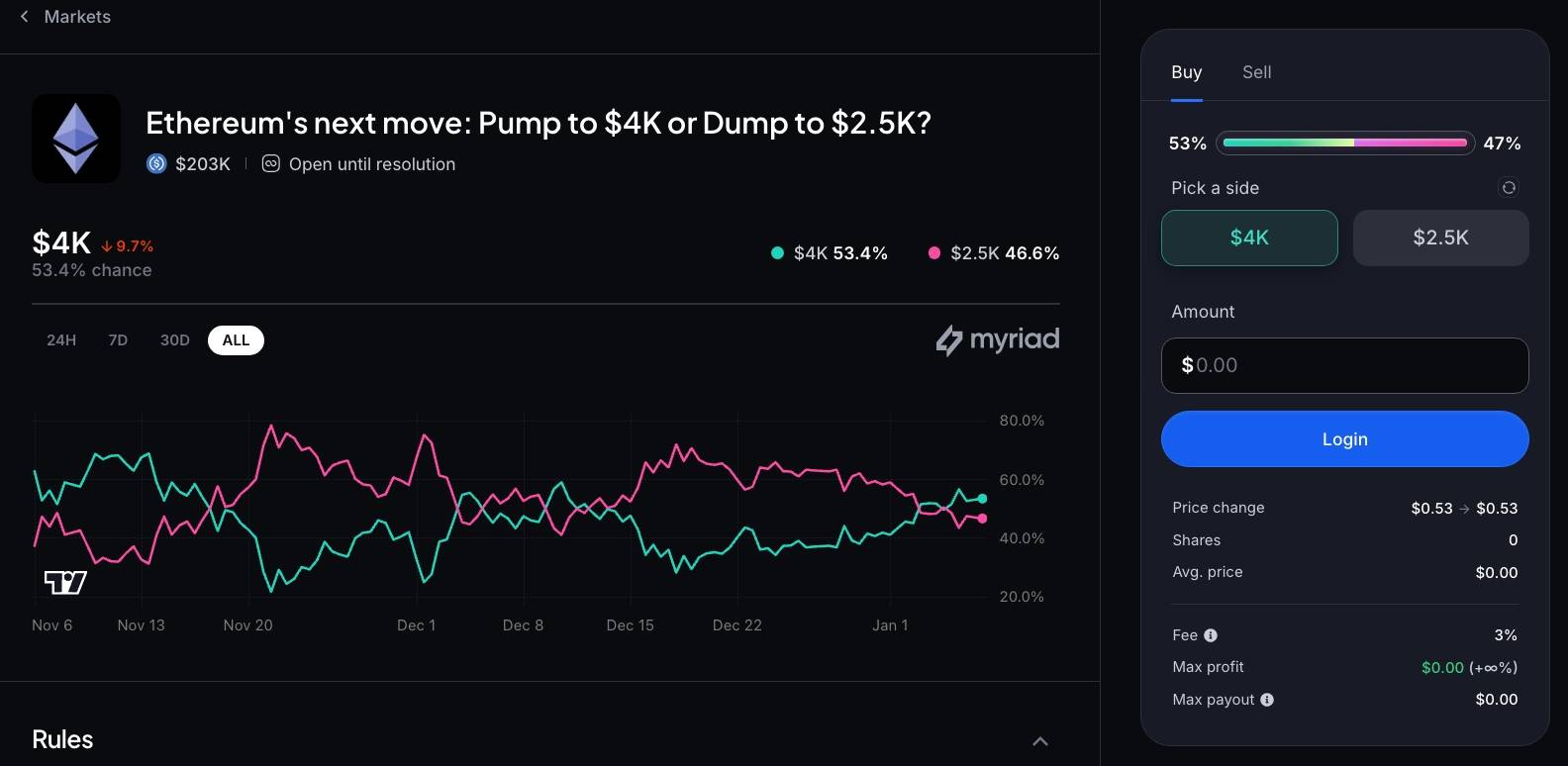 Xác xuất cược ETH sẽ tăng giá. Nguồn: Myriad