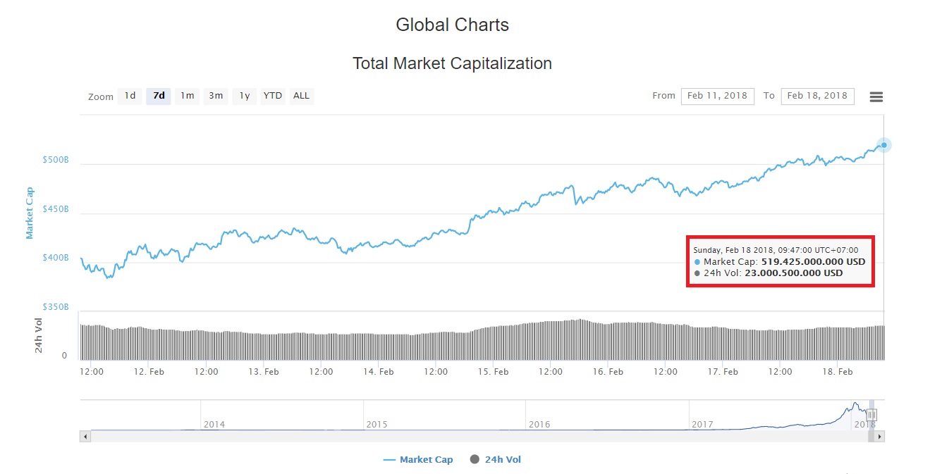 Sau một khởi đầu tương đối yếu trong tháng 2 này, vốn hoá thị trường các đồng tiền điện tử đã thêm một lần nữa vượt ngưỡng 500 tỉ đô trong ngày hôm nay (18/02). Ở thời điểm thực hiện bài viết, con số này đã là 519 tỉ USD.