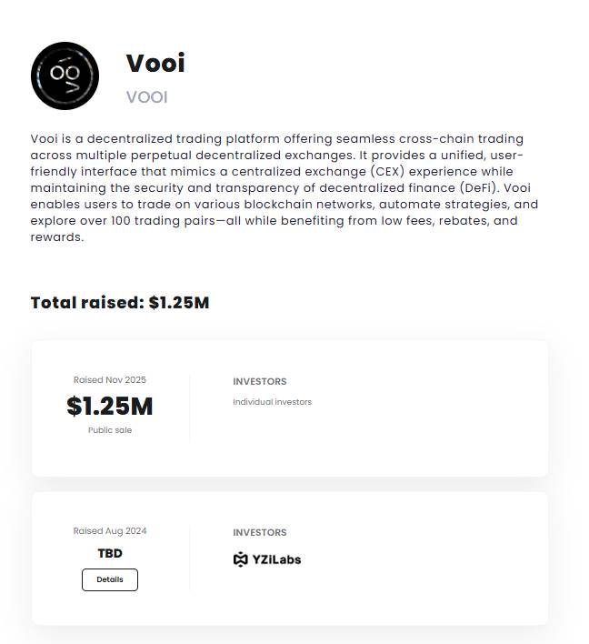 VOOI được đầu tư bởi YZi Labs (Binance Labs cũ) vào tháng 8/2024 nhưng chưa rõ số tiền huy động được. Ngoài ra, dự án còn gọi thêm 1,25 triệu USD thông qua đợt mở bán token (IDO) trên nền tảng Legion.