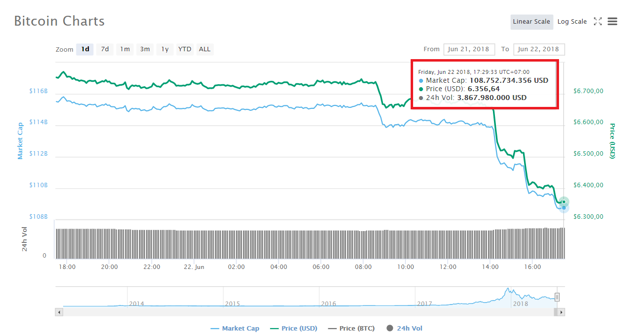 Cụ thể, giá đã có sụt sâu xuống mức $6,286 trên sàn Bitfinex, mốc thấp nhất kể từ ngày 14/06 đến nay, và hiện đang được giao dịch quanh mức $6,320, giảm 6% so với cách đây 24 giờ.