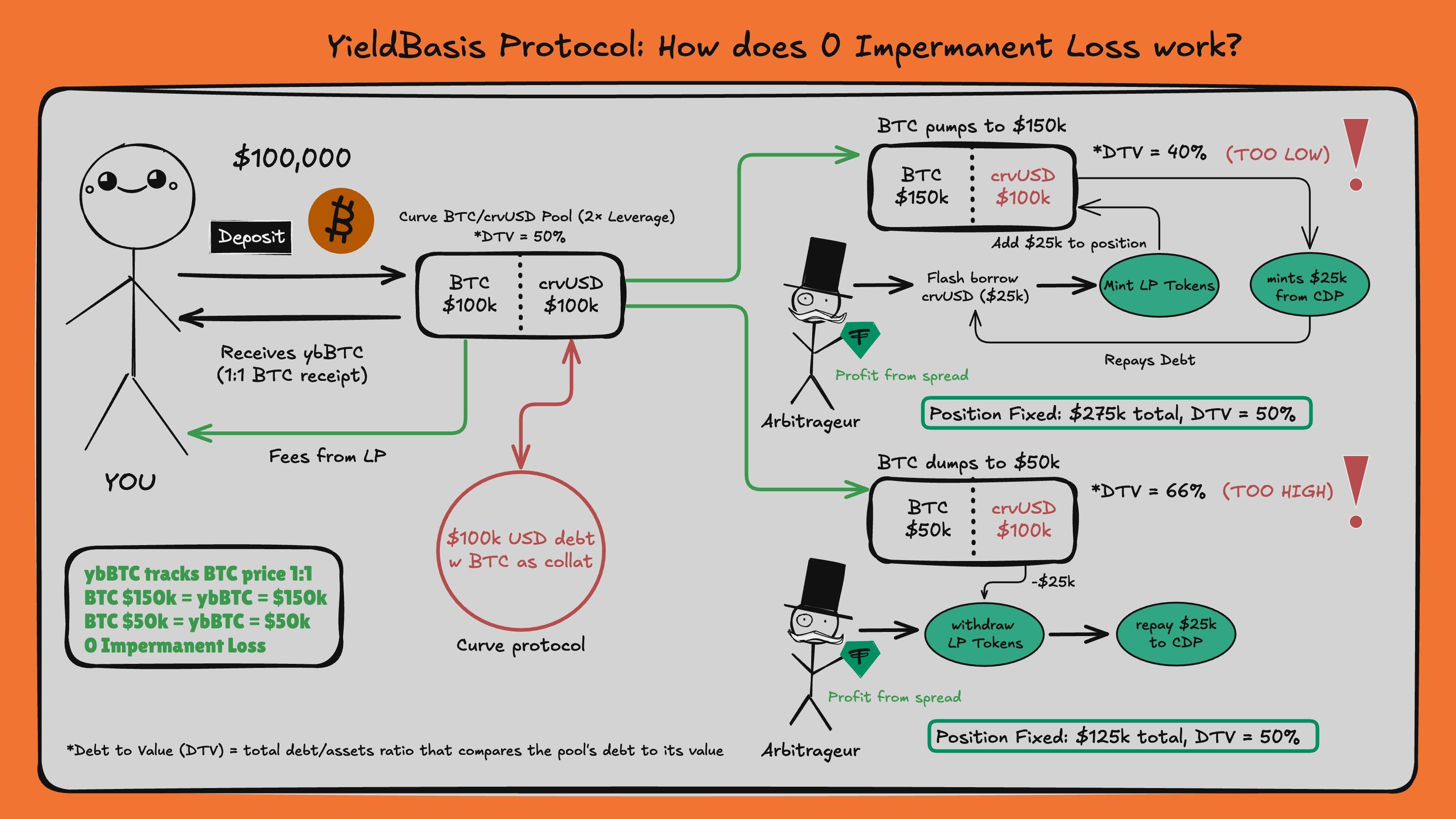 Yield Basis vay thêm 100.000 crvUSD sau đó đưa vào pool BTC/crvUSD của Curve để tạo vị thế đòn bẩy X2 (100.000 USD từ BTC của bạn + 100.000 USD từ crvUSD vay).