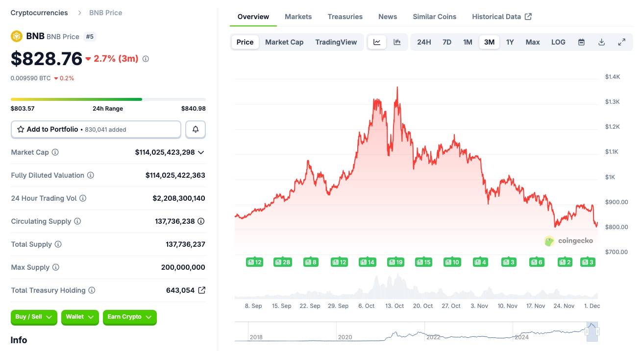 BNB đang giao dịch quanh mức thấp nhất 3 tháng qua, chỉ quanh 830 USD, giảm mất so với đỉnh lịch sử 1.375 USD lập hồi đầu tháng 10. Điều này khiến quỹ dự trữ BNB Network - khoảng 515.000 BNB, trị giá ~412 triệu USD với giá vốn bình quân 851 USD - rơi vào trạng thái lỗ chưa thực hiện.