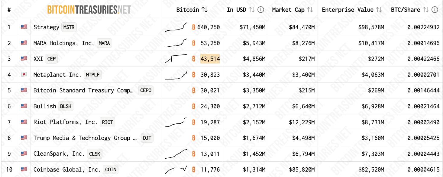 - Theo dữ liệu từ BitcoinTreasuries.net, dẫn đầu bảng xếp hạng hiện là Strategy (tên mới của MicroStrategy) với 640.250 BTC, theo sau là MARA Holdings với 53.250 BTC, và XXI ở vị trí thứ 3 với 43.514 BTC.